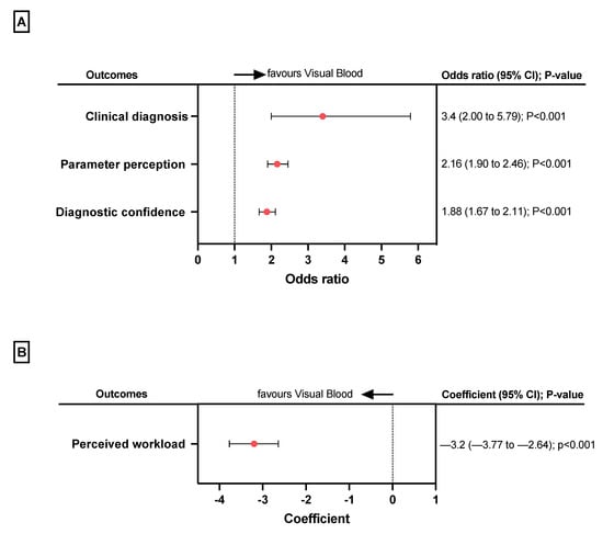 The results of the second part of the study. (A) The forest plots present the results of the mixed logistic regression models with a random intercept per participant for the outcomes of clinical diagnoses, parameter perception, and diagnostic confidence (B). The forest plot presents the linear mixed model results for the outcome of perceived workload. A negative coefficient means a lower workload using VB. CI, confidence interval.