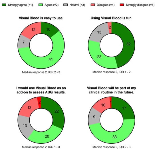 Fifty-one of seventy (73%) participants agreed or strongly agreed that VB was easy to use, fifty-five of seventy (79%) agreed that it was fun to use, and forty-two of seventy (60%) agreed that they would use it as an add-on to a conventional presentation of ABG results. Fifty of seventy (71%) participants agreed or strongly agreed that they thought VB would become part of their clinical routine. Figure 4 illustrates the four statements sampling participants’ general opinions about VB.