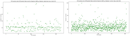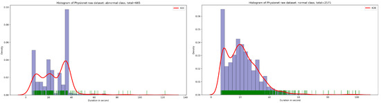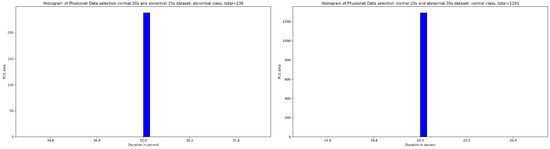 The publicly available Physionet dataset [14] is a not balanced PCG dataset which contains 665 normal sample and 2575 abnormal sample in WAV format. As shown in Figure 1, the majority of PCG samples are concentrated in the duration range between 8 and 40 s for normal and abnormal class.