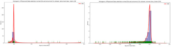 Based on the discovery issued from the KDE curve shown in Figure 2, the idea is to select all the PCG samples for normal classes with signal duration equal to 20 s and 35 s for abnormal class. As seen in Figure 5, after applying this simple selection process, we obtain 238 PCG samples from abnormal class and 1291 PCG samples from normal class. If we look at the Figure 6 and Figure 7, the obtained PCG samples after the KDE duration selection process for normal and abnormal classes have acceptable SNR values with a high SNR concentration, very close to zero.