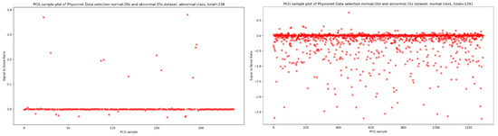 The PCG data distribution of normal and abnormal classes after selecting the highest dense cluster issued from GMM biclustering.