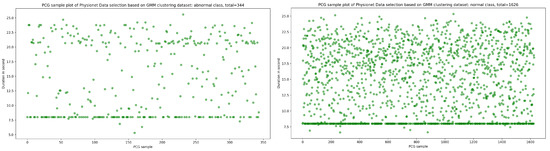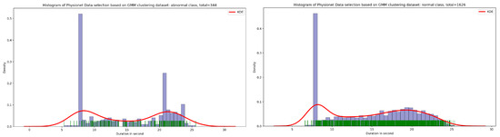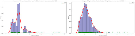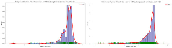 As seen in Figure 12, the result of the selection process based on the highest dense cluster issued from GMM biclustering gives us a 334 PCG sample for the abnormal class and a 1626 PCG sample for the abnormal class. The KDE curve in the function of duration and SNR related to normal and abnormal PCG samples is shown, respectively, in Figure 13 and Figure 14. Furthermore, Figure 15 gives us an overview of the KDE curve in function of SNR for normal and abnormal PCG classes after the GMM data selection process.