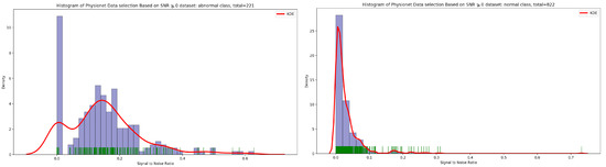 Concerning the signal-to-noise ratio (SNR) sample distribution in the function of density (as seen in Figure 3), we can deduce that the highest KDE value of SNR for normal and abnormal classes is zero. This means that the majority of Physionet PCG samples are approximately clean with an acceptable noise signal.