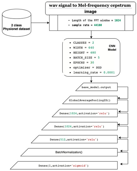 In this paper, we present a CNN classification system based on transfer learning and fine-tuning. Our system starts with the Physionet dataset, which we use to train the model. Figure 16 shows the architecture of our system, which is built on pretrained CNN models from ImageNet dataset. The first step involves transforming the wav PCG signals into mel spectrogram images using an FFT window of 1024 and a sample rate of 44,100. The second step defines the CNN parameters, including a two-class recognition, an input image size of width = 640 and height = 480, a batch size of 5, 30 epochs, and stochastic gradient descent as the optimizer with a learning rate of 0.0001. In the third step, we fine-tune the layers by using convolutional layers from the pretrained CNN models as feature extraction layers. Additionally, we add six layers including a GlobalAveragePooling2D layer for averaging and better representation of our training vector, three dense layers for the full connected network, a BatchNormalization layer to limit covariate shift, and a dense layer with a sigmoid activation function to obtain a classification value between 0 and 1 (probability).