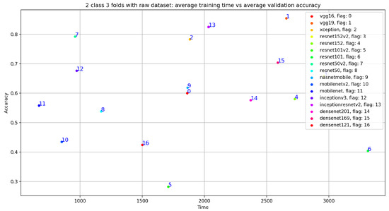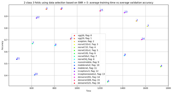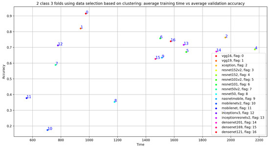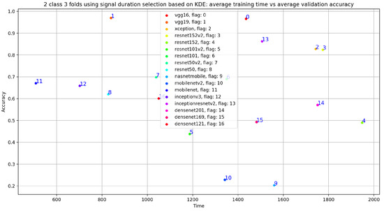 In this subsection, we investigate the impact of selecting training data using unsupervised biclustering. We used GMM biclustering with the hypothesis to consider the cluster with the maximum number of sample as our training data. As shown in Table 6 and in Figure 25, we obtained good classification results compared to results without using any data selection method. However, if we compare with the previous results, we can conclude that the best results are obtained using signal selection, based on duration 20 s for normal and 35 s for abnormal PCG data. In this configuration, VGG16 gives the best classification metrics compared to the remaining 16 CNN models with an acceptable training time (sixth position) as seen in Figure 26.