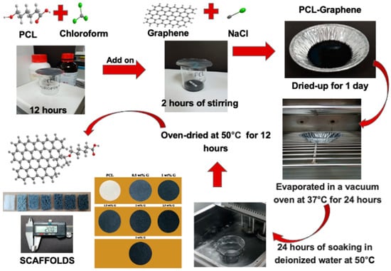 A solvent casting and particle leaching method was used to fabricate PCL and PCL/G scaffolds [10]. PCL (Sigma-Aldrich, Merck, Darmstadt, Germany) was dissolved in chloroform (Honeywell, Charlotte, USA) at room temperature for 12 h. This combination was then mixed with various concentrations of G and NaCl for 2 h. G was previously produced by transferring a graphite intercalation compound into a preheated crucible at 700 °C in a common furnace positioned in the front of a fume cupboard to prevent inhalation of the nanoparticles, and it was left there for 60 s. These layers expanded upon ultrasonication and caused the G to disperse in the solvent. After fabrication, the blend was placed into a cast and cured overnight at room temperature. Chloroform was then evaporated for 24 h at 37 °C in a drying vacuum oven (Deng Yng, Taipei, Taiwan). Deionized (DI) water and a water bath (BH-130D, Taipei, Taiwan) were used to remove porogen from the scaffold. In addition, the DI water was changed every 2 h and then dried in the oven at 50 °C for 12 h. Scaffold fabrication is illustrated in Figure 1.