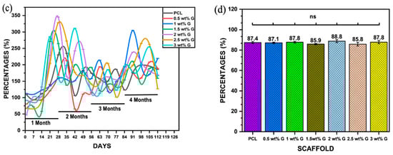Another physical characteristic that must be determined is the water absorption rate, which is essential for evaluating a composite material’s suitability for bone tissue regeneration. This is because it represents the effectiveness of body fluid absorption and nutrient transfer [18,31]. Figure 2c shows the water absorption rates of the PCL and the PCL with G (a hydrophilic material) over a 4-month period in PBS solution. The results showed that samples containing G had higher water absorption than PCL due to the hydrophilic properties of G. The percentage of water absorption varied from 50% to 350% during the 4 months, with the highest values observed in samples containing 2, 2.5, 1.5, and 3 wt% G in the first month, but only 2 and 3 wt% G maintained a high volume of PBS throughout the second month. By the third month, every scaffold’s capacity had been reduced, although the capacities of 1, 2, 2.5, and 3 wt% G increased yet again in the fourth month. The results suggest that the water absorption capacity can be improved by controlling the WCA, porosity, and pore size of the scaffold [31,32].