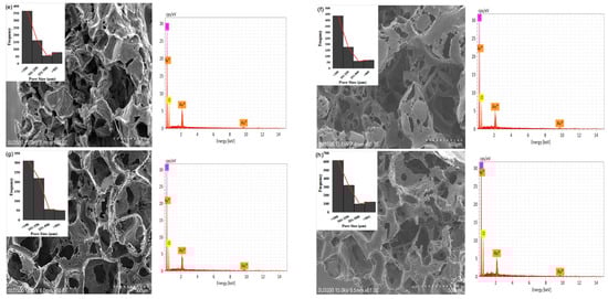 SEM of morphology, pore distribution, and SEM-EDS of scaffold: (a) graphene; (b) PCL; (c) 0.5 wt% G; (d) 1 wt% G; (e) 1.5 wt% G; (f) 2 wt% G; (g) 2.5 wt% G; (h) 3 wt% G.
