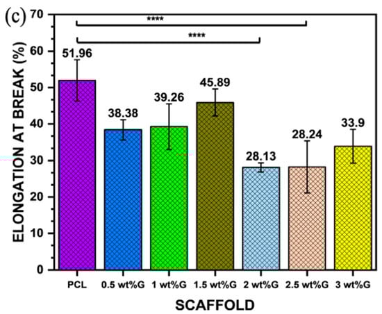 Mechanical properties: (a) Young’s modulus value of PCL/G scaffold; n = 3; *** p < 0.001. (b) Ultimate tensile strength (σmax) of PCL/G scaffold; n = 3; *** p < 0.001. (c) Elongation-at-break (εb) of PCL/G scaffold; n = 3; **** p < 0.0001.