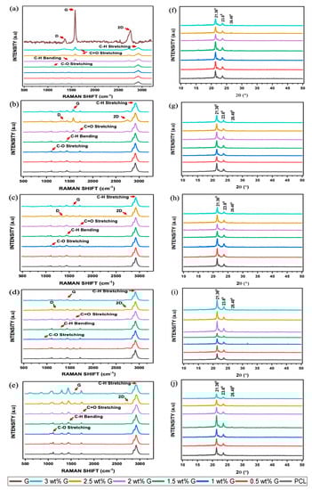 The results of XRD experiment are in line with that of the Raman spectroscopic analysis. Two major peaks were found at 2θ = 21.36° and 23.6° in the diffraction pattern of the semicrystalline PCL. Furthermore, the addition of G did not have a substantial impact on 2θ = 21.36°, but there was a slight decrease at 2θ = 23.6°, as shown in Figure 5f. The peak at 2θ = 26.48° improved as the concentration of G increased. Previous studies showed that increasing its concentration led to an increment in functionalized oxygen. It also enhanced the capacity of G to disperse in water or cell culture media, which can increase cell viability [51,52].