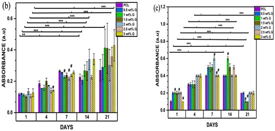The MTT assay for cell proliferation showed that the concentrations of 1, 1.5, and 3 wt% G increased steadily from day 1 to day 21, but the value for 3 wt% G was greater compared to the others (p < 0.001). This shows that they were suitable for the growth of osteoblast-like (MG-63) cells due to their consistent growth over a period of 21 days. Nevertheless, PCL and 0.5 wt% G increased from day 1 to day 7, decreased on day 14, and then increased slightly on day 21 (p < 0.001). This current study revealed that scaffold properties, such as physical (WCA) or mechanical (Young’s modulus) characteristics, have a correlation. They also increase the phase of cell proliferation by prolonging cell growth or inhibiting cellular differentiation, as shown in Figure 6b,c. The MTT result on day 21 increased, while that of the ALP declined [60,61].