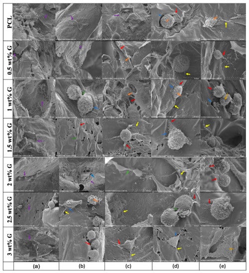 SEM analysis was also carried out on osteoblast-like (MG-63) cells. On the first day (Figure 7a), the cells were uniformly distributed and adhered to the scaffolds at various concentrations. Furthermore, protruding cell membranes were observed on day 4 (Figure 7b) as evidence of their interactions with the surroundings using PCL, 0.5, and 2 wt% G scaffolds. For 1 and 3 wt% G, the cells had a round shape with protruding filaments indicating that they were entering the mitotic process. On days 7 and 14 (Figure 7c,d), almost all the cells had a round appearance, except for those on the PCL scaffold, which retained their flat shape, and the 3 wt% G scaffolds with a triangular appearance on day 7, 14, and 21 (Figure 7c–e). This indicates that the addition of G to the PCL scaffold enhanced both the proliferation and differentiation of cells [64,65].