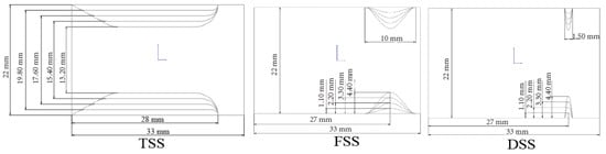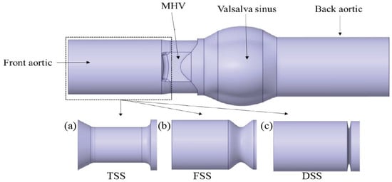 This research utilized the 23-mm On-X heart valve. The model was generated using SolidWorks software, with structural information obtained from Mirkhani et al. []. The simulation domain consisted of four components: the front aortic section, the MHV, the Valsalva sinus, and the back aortic section, as illustrated in Figure 1. Depending on the structural differences, there were three separate types of SAS: TSS (tunnel SAS), FSS (fibromuscular annulus SAS), and DSS (discrete SAS).