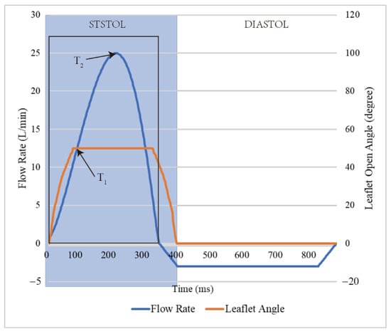 Flow rate pulse of the aorta inlet and leaflet open angle changes.