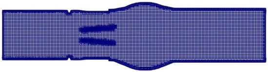 where u is the velocity vector, p is the pressure, μ is the viscosity, and ρ is the density. The density value was set at 1060 kg/m3 []. The governing equation is based on the OpenFOAM solver []. The pimpleFoam solvers in OpenFOAM can automatically adjust the time step, with a time step of ) and maxCo set to 1 to limit the timestep adjustment. To simulate the shear-thinning behavior of blood, the Navier-Stokes equations were integrated with an appropriate non-Newtonian constitutive model of dynamic viscosity; in this case, the well-known Carreau model was used []. is the viscosity at zero shear rate, is the viscosity at infinite shear rate, λ is a time constant of the fluid, is the shear rate, and n is a dimensionless parameter that characterizes the degree of shear-thinning.