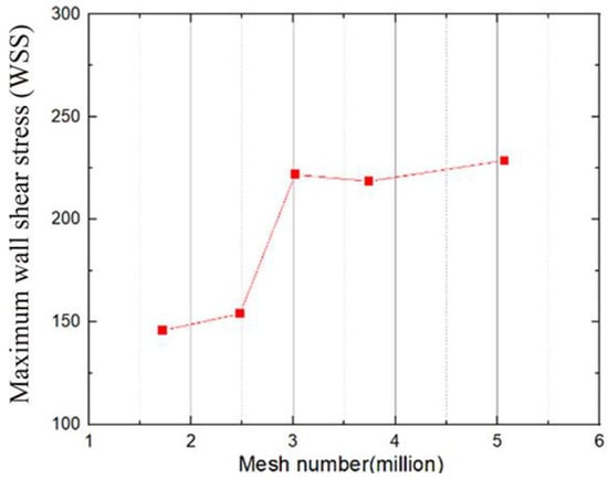 The grid independence was verified using five groups of different grid numbers and by comparing the maximum wall shear stress (WSS) obtained, as illustrated in Figure 5. When the number of grids reached approximately three million, the WSS stabilized, and the number of grids did not increase significantly. The final mesh count was determined to be 3.02 million, in which the minimum cell size was set at 1 mm, the maximum cell size was set at 5 mm, for refinement, the aortic wall was set at 2 mm, and the leaflet wall was set at 0.7 mm to ensure the accuracy of mesh generation. In addition, the current CFD model was compared with the numerical and experimental results of Bluestein et al. [] by the blood flow of normal BMHV around the systolic peak. Velocity profiles were acquired downstream of the valve and in proximity to the caudal region of the leaflet and were normalized to the plotted velocity and location. As depicted in Figure 6, the results of this study were found to be in good agreement with previous studies.