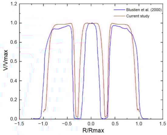 Comparison between the normalized velocities of the current study and the numerical study of Blustien et al. [].