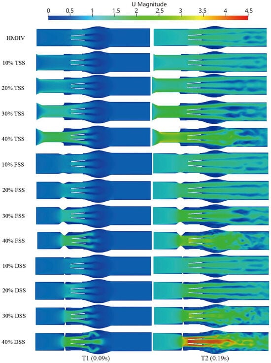 In the systole phase, the velocity profile of the entire field was investigated under normal cardiac output at two different instants: 100 ms (mid-acceleration phase) and 200 ms (peak systole phase). The structure with MHV and different percentages of SAS (10%, 20%, 30%, and 40%) are shown in Figure 7. In the absence of SAS, the blood flow through the MHV experienced acceleration and the formation of three-jet flow (one central and two sides), followed by dissipation into a chaotic flow state. When blood flows through the SAS, the existence of SAS triggers the acceleration of blood flow in advance, and the degree of acceleration depends on the percentage and shape of SAS. In the absence of SAS or in cases of low SAS percentages, a distinct triple jet pattern is observed, which interacts as the three jets flow and generates a secondary flow pattern that dissipates the jet. As the percentage of the SAS barrier increases, the interaction between the three jets intensifies, causing the blood flow to advance towards dissipation. The impact of SAS types, specifically FSS and DSS, on early dissipation is pronounced, with DSS having the most significant impact on accelerating blood flow under the same obstacle percentage.