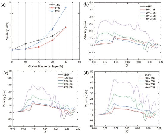 Velocity comparison of (a) obstruction vs. peak velocity and velocity change along the centerline (b) TSS, (c) FSS, (d) DSS (t = 0.2 s).