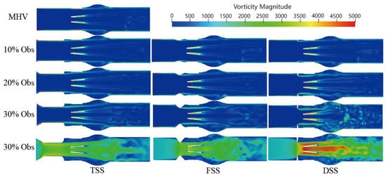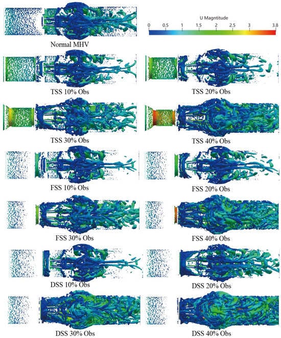 A small-scale chaotic vortex structure was formed before the MHV, and the structure was well organized and layered. The vortex ring disintegrated rapidly once the MHV interacted with the leaflet and rearranged into flow-oriented vortex filaments. Large vortex structures were mainly concentrated in the sinus region. In comparison to healthy MHV, due to the presence of the SAS, the three-dimensionally increased flow occurred after blood flow through the SAS. The content of the vortex structure surged; with the increase of the obstruction percentage, the large-scale transient vortices rearranged into smaller longitudinal vortex filaments that filled the entire watershed of the SAS.