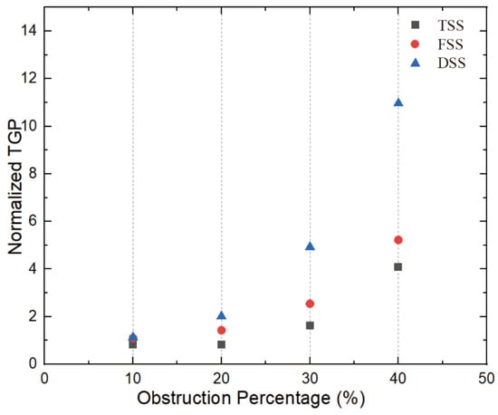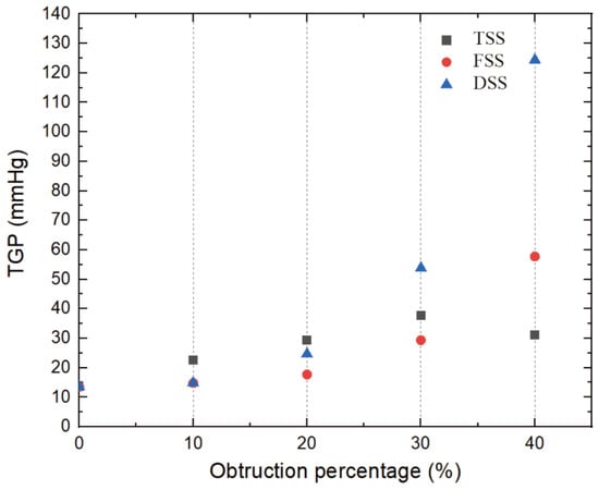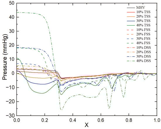 Figure 11 shows the pressure of the cut plane along the centerline of the flow direction. In the case of a healthy MHV, the pressure in front of the anterior edge of the leaflets dropped rapidly due to MHV installation, was nearly constant through the MHV and the sinus of Valsalva, and was nearly constant in the aorta. The flow passed through the MHV and sinus of Valsalva and recovered in the ascending aorta. The presence of SAS led to a significant increase in the pressure drop along the axial direction, with the pressure drop increasing as the degree of stenosis increased. Additionally, the pressure drop was more pronounced in the vicinity of the SAS, indicating that the obstruction caused by the SAS had a significant impact on the pressure drop. This is because the obstruction of blood flow through the narrow passage of the SAS results in an increase in velocity and turbulence, which in turn leads to an increase in pressure drop. Of the three types of SAS, DSS has an obstructive surface that overlaps the aortic annulus, resulting in only a sizeable annular obstruction of the entire fluid pathway. In the case of the same obstacle percentage, the effect of DSS on the pressure drop is the most obvious. Figure 12 shows the normalized transvalvular pressure gradients (TPG). An increase in the percentage of obstruction resulted in a parabolic increase in the TPG. The TGP differences between the different types were not significant at low handicap percentages but became more pronounced between DSS and the other two SASs as the handicap percentages increased. At 40% obstruction, TSS and FSS were approximately five times higher than TPG without SAS, while DSS TPG was approximately 11 times higher than TGP without SAS and twice as high as the other two SAS. This suggests that the different types of SAS have a significant impact on the TPG.