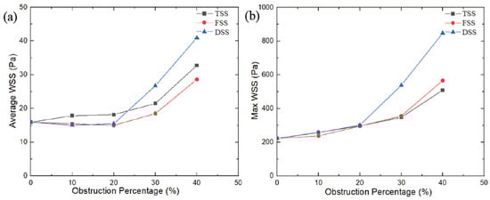 WSS VS obstruction percentage (a) Average WSS, (b) Max WSS (t = 0.2 s).
