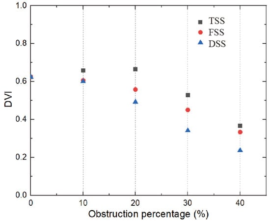 The relationship between DVI and SAS is shown in Figure 15, which is inversely proportional to the severity of the stenosis (the larger the obstruction, the smaller the DVI). This threshold was reached for all types of SAS when the obstruction percentage was greater than 30%. The DVI value was greater than 0.5 in the absence of stenosis and mild stenosis, while in severe stenosis, the previous threshold of 0.3 could be used for the zone.