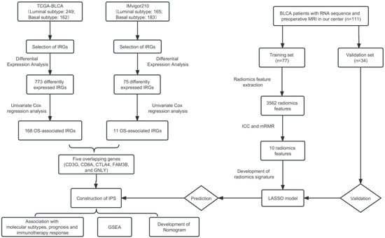The workflow of this study. TCGA, The Cancer Genome Atlas; BLCA, bladder cancer; IRGs, immune-related genes; OS, overall survival; IPS, immune prognostic signature; GSEA, functional enrichment analysis; ICC, intra- and interclass correlation coefficient; mRMR, minimum redundancy maximum relevance; LASSO, least absolute shrinkage and selection operator.