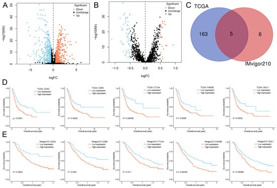 Selection of OS-associated IRGs. (A) Volcano plot of 739 IRGs differentially expressed between luminal and basal subtypes in TCGA. (B) Volcano plot of 75 IRGs differentially expressed between luminal and basal subtypes in IMvigor210. (C) Venn diagram of the five common OS-associated IRGs between TCGA and IMvigor210. (D) Kaplan–Meier curves of OS for patients based on five selected IRGs in TCGA. (E) Kaplan–Meier curves of OS for patients based on five selected IRGs in IMvigor210. OS, overall survival; IRGs, immune-related genes; TCGA, The Cancer Genome Atlas; FC, fold change.