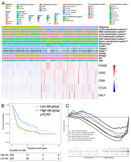 Each subject’s risk score was derived based on the expression of the five genes and the aforementioned formula. In TCGA, the high-risk group was positively associated with clinicopathological features, including pathological stage, morphology, histological grade, as well as the T, M, and N stages (Figure 4A), and subjects in this group had considerably poorer OS than those at lower risk (Figure 4B). GSEA showed that several oncogenic KEGG signaling pathways, including ‘BLADDER_CANCER’, ‘JAK_STAT’, ‘NOTCH, ‘KEGG_PATHWAYS_IN_CANCER’, ‘TGF_BETA’, and ‘WNT’, were coenriched in the more at-risk group (Figure 4C).