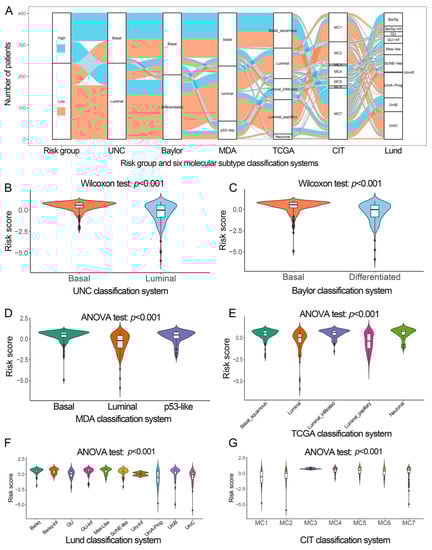 The risk group was considerably linked to six classification approaches (Figure 5A), and the basal subtype had a significantly higher risk score than the luminal subtype (Figure 5B–G).