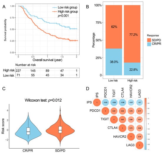 In IMvigor210, subjects in the low-risk group had poorer OS than those in the high-risk group (Figure 6A). In addition, subjects in the low-risk group had an increased percentage of partial response (PR)/complete response (CR) compared to those in the high-risk group (38.0% and 22.8%, respectively; Figure 6B). PR/CR subjects had considerably decreased risk scores compared to progressive disease (PD)/stable disease (SD) subjects (Figure 6C). In addition, IPS was negatively related to the expression profiles of critical immune checkpoint genes (Figure 6D).