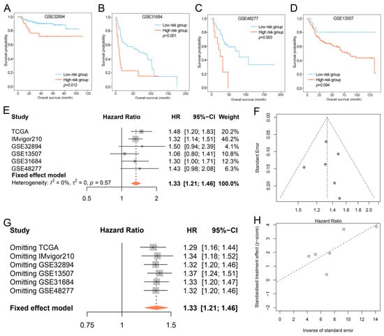 Prognostic value of IPS in validation data sets. (A–D) Kaplan–Meier OS curves for patients assigned to high- and low-risk groups in the GSE32894 (A), GSE31684 (B), GSE48277 (C), and GSE13507 (D) data sets. (E) Forest plots of pooled HRs for investigating the impact of IPS on OS in each data set. (F) Funnel plots of meta-analysis. (G) Sensitivity analysis of meta-analysis. (H) Egger’s publication bias plot of meta-analysis. IPS, immune prognostic signature; OS, overall survival; HR, hazard ratio; CI, confidence interval.