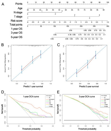 In a univariate Cox regression analysis, IPS, age, monograph, stage, histological grade, T stage, and N stage were linked to OS and introduced into multivariate Cox regression analysis (Table 1). IPS, age, and T and N stages were indicated to be significant and were selected to develop the nomogram for predicting 1-, 3- and 5-year OS (Figure 8A). Calibration plots presented a considerable consistency with actual 1- and 3-year OS (Figure 8B,C). DCA further indicated the clinical usefulness of the nomogram (Figure 8D,E).