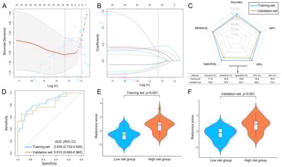 In addition, 0.762 to 0.908 was determined as the range of the inter-reader ICC between the two radiologists, indicating favorable inter- and intraobserver reproducibility. The features in the top 10 positions as ranked by mRMR were retained and utilized for the development of radiomics signatures. Therefore, we constructed a LASSO model based on these ten features (Figure 9A,B). These aforementioned features did not show a strong correlation with one another (Figure S1; mean absolute Spearman ρ = 0.158), revealing that the valuable radiomics features were obtained and that overfitting was avoided. The feature’s coefficients were also examined (Figure S1). The performance of the LASSO model was investigated (Figure 9C), with AUC values for the training and validation sets of 0.839 and 0.810, respectively (Figure 9D). In addition, individuals in the high-risk group showed considerably elevated radiomics scores as compared to those in the low-risk group in the two sets (Figure 9E,F; both p < 0.001).