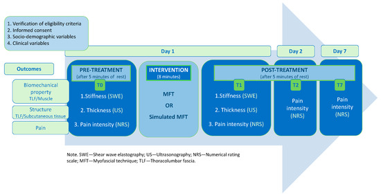 The main objective of this study was to evaluate the immediate effect of a standardized versus a simulated MFT on the stiffness of the TLF and lumbar erector spinae muscles using shear wave elastography. The secondary objectives were to evaluate the immediate effects of the MFT versus the simulated MFT on (1) the thickness of the TLF and (2) pain intensity. We hypothesized that the standardized MFT would lead to a decrease in TLF and erector spinae muscle stiffness, a decrease in the thickness of the posterior layer of the TLF, and an immediate/short-term decrease in pain intensity when compared with the simulated MFT.