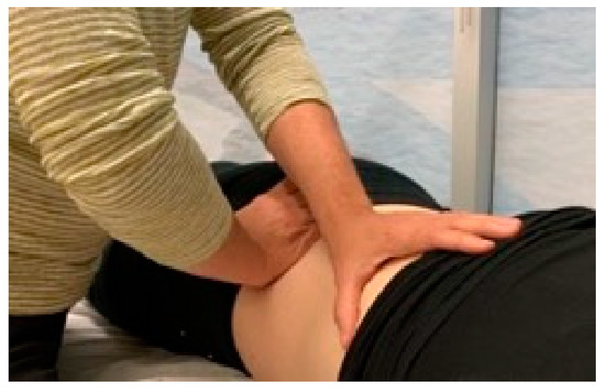 An experienced osteopath performed both the standardized and simulated MFTs. The MFT was a direct myofascial release technique. According to the definition in the glossary of osteopathic terminology, “direct myofascial release” is a method that uses continual palpatory feedback where “the dysfunctional myofascial tissues are loaded and the restrictive barrier is engaged with a constant force” [42] (p. 38). The MFT was performed as in routine clinical practice. The osteopath was positioned laterally to the participant, with their forearms crossed, caudal hand on the ilium, and cephalad hand on the posterior/inferior thorax, as described by Wong et al. [34] (Figure 2). The cephalad hand was sometimes moved towards the center or the contralateral thorax depending on the perceived tension. Gentle pressure was applied in order to target the TLF and erector spinae muscles. The therapist then applied tension between her hands in the different planes, according to the perceived tension, until reaching a restrictive barrier. The tension was maintained until an initial release was perceived; then, the therapist adjusted the tension applied on the tissue until reaching a new restrictive barrier. The technique was performed for four minutes on each side, starting on the left. The simulated MFT was performed in the same way but with superficial contact on the skin and no tension applied between the hands.