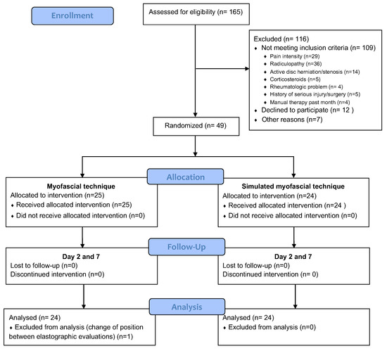 A total of 49 participants met the eligibility criteria and were enrolled in the study (25 male/24 female). They were randomized to the MFT group (intervention) or the simulated group (control). One participant was excluded from the analysis due to a change in position during experimentation, which is why one additional participant was included in the sample. Figure 5 shows the participant flow diagram.