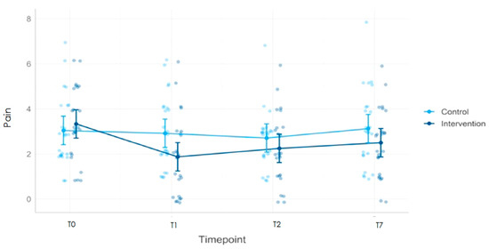 Pain intensity was assessed using the numerical rating scale (NRS; ranging from 0 to 10). The NRS was chosen because it is widely used in both clinical and research settings and has shown good sensitivity to change [49,50]. The participants were contacted by phone for measurements at T2 and T7. In the literature, a 20% change is considered clinically significant for chronic pain [49].