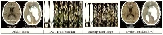 Figure 3. This diagram shows the order of conversion, compression, decompression, and inverse conversion processes. To realize this methodology, we took as input cerebral hemorrhage steganography images already embedded in patient data and applied the DWT to obtain the transformed images.