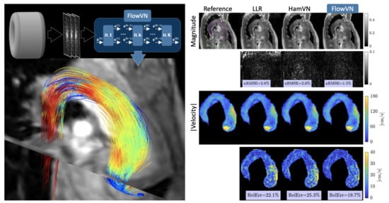 - Vishnevskiy, V.; Walheim, J.; Kozerke, S. Deep variational network for rapid 4D flow MRI reconstruction. Nat. Mach. Intell. 2020, 2, 228–235. [Google Scholar] [CrossRef]