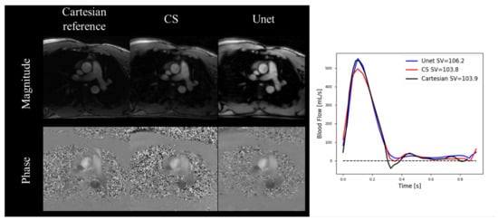 Jaubert et al. proposed a DL-based reconstruction using complex-valued images for a spiral real-time 2D-Flow [100]. They trained a 3D U-Net using synthetic real-time spiral 2D-Flow datasets, generated from 520 ECG-gated breath-hold patient datasets. They prospectively undersampled 20 patient datasets and compared the ECG-gated 2D-Flow and the proposed real-time 2D-Flow sequence with uniform density spiral undersampling for R = 18. Compared to the ECG-gated 2D-Flow with R = 2 PI, their prospectively deployed real-time radial 2D-Flow sequence with DL-based reconstruction provided comparable measurements of the stroke volume (−0.8 [−10.5, 8.9] mL) and peak mean velocity (−2.5 [−13.7, 8.7] cm/s) in the aAo while also demonstrating a reduced bias and tighter LOA for the stroke volume but not the peak mean velocity, compared to the CS [107]. They later expanded their original work to demonstrate real-time 2D-Flow measurements, including visualization on the scanner of the beat-to-beat heart rate, stroke volume, and cardiac output with a mean latency of 622 ms [101]. Importantly, no significant differences were observed between the reference R = 2 PI methods at rest (−0.21 ± 0.50 L/min, p = 0.25) or the CS at peak exercise (0.12 ± 0.48 L/min, p = 0.46). A representative patient dataset is included in Figure 4, highlighting the improvement in their U-Net over CS.