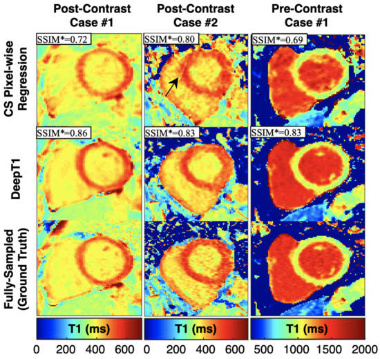 - Jeelani, H.; Yang, Y.; Zhou, R.; Kramer, C.M.; Salerno, M.; Weller, D.S. A myocardial T1-mapping framework with recurrent and U-Net convolutional neural networks. In Proceedings of the 2020 IEEE International Symposium on Biomedical Imaging (ISBI), Iowa City, IA, USA, 3–7 April 2020; pp. 1941–1944. [Google Scholar]