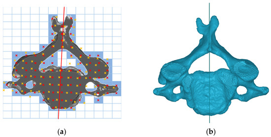 The degree of asymmetry is usually determined by comparing bilateral landmarks or contours. The symmetry plane is the most representative indicator. Based on computed tomography (CT), a voxel-based method was used in this study to find the OSP of bony tissues in the vertebrae. The OSP was computed using an optimization algorithm to find the plane that had the maximum number of voxel pairs of bilateral parts. Based on this unique OSP, the degree of asymmetry can be quantified. On one of the horizontal segmentation images of a cervical vertebra, for example, Figure 1a illustrates a possible symmetry line (in red) with its bilateral paired pixels indicated in red and its correspondence yellow crosses. Expanding the diagram to three dimensions by minimizing the voxel function,