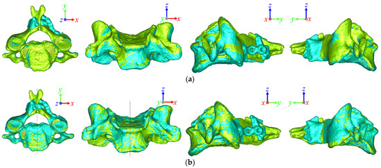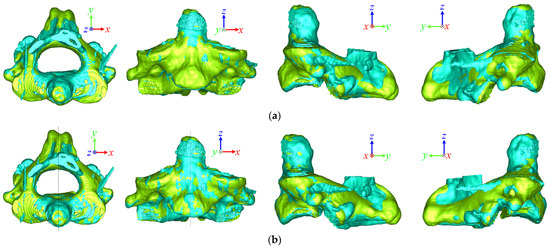 Superposition comparison of the (a) ICP and (b) OSP-based contouring methods for a pre- and post-surgical C2 vertebra in the pedicle screw fixation case.