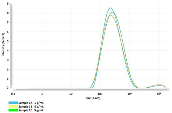 Moreover, the concentration of nanoparticles of different sizes was analysed in the colloidal dispersion by performing a Multi-Angle Dynamic Light Scattering (MADLS). The analysis was performed at three scattering angles: Backscatter 173° (NIBS), Side scatter 90° (DLS) and Forward scatter 17°. The scattered radiations were measured using disposable polystyrene cuvettes DTS0012. In all experiments, the measurement position was automatic for MADLS, whereas the correlation time was an adaptive correlation.