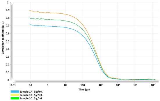 GlcNAc NP autocorrelation functions regarding the effects of sample dilutions and scattering at a fixed angle. Samples were obtained from three independent preparations: Sample 1A (blue line), Sample 1B (yellow line), and Sample 1C (green line). The intercepts of curves show that all coefficients are inside the range from 0.7 to 0.9 and the curve slopes suggest a low effect of scattering among particles with different sizes.