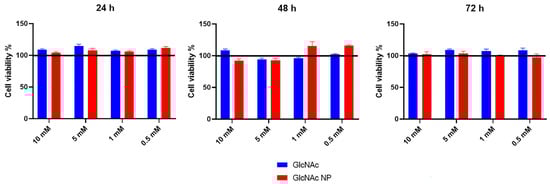 The MTS colourimetric method was performed to assess the cell viability of HPCs treated with four different concentrations of GlcNAc and GlcNAc NP (10 mM, 5 mM, 1 mM, and 0.5 mM), for 24, 48, and 72 h. Cell viability of treated samples was normalized to the untreated cells, which is reported as 100% and represented in the graphs by a black horizontal line.