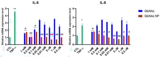 Effects of GlcNAc and GlcNAc NP on interleukins mRNA expression levels under TNF-α stimulus. Cells were left untreated (CTL), stimulated with 10 ng/mL TNF-α for 30 min, or treated with different concentrations of GlcNAc and GlcNAc NP for 1 h and then stimulated with 10 ng/mL TNF-α for 30 min. After treatments, mRNA was extracted and analysed by RT-PCR. IL-6 and IL-8 mRNA levels were reported as relative mRNA expression levels with respect to 18S mRNA (2−ΔΔCt method). Results are expressed as mean ± standard deviation (SD) of data obtained by three independent experiments. * p < 0.05; ** p < 0.01 vs. CTL; # p < 0.05; ## p < 0.01 vs. TNF-α.