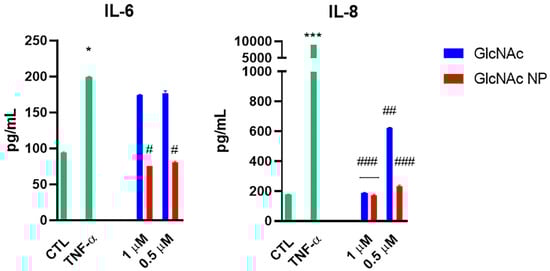 Effects of GlcNAc and GlcNAc NP on interleukins secretion in the culture medium under TNF-α stimulus. Cells were left untreated (CTL), stimulated with 10 ng/mL TNF-α for 30 min, or treated with two concentrations of GlcNAc and GlcNAc NP for 1 h and then stimulated with 10 ng/mL TNF-α for 1 h. After treatments, cell supernatants were collected and analysed by ELISA. The results are reported as pg/mL and are expressed as mean ± SD of data obtained by three independent experiments. * p < 0.05 and *** p < 0.005 vs. CTL; # p < 0.05, ## p < 0.01 and ### p < 0.005 vs. TNF-α.